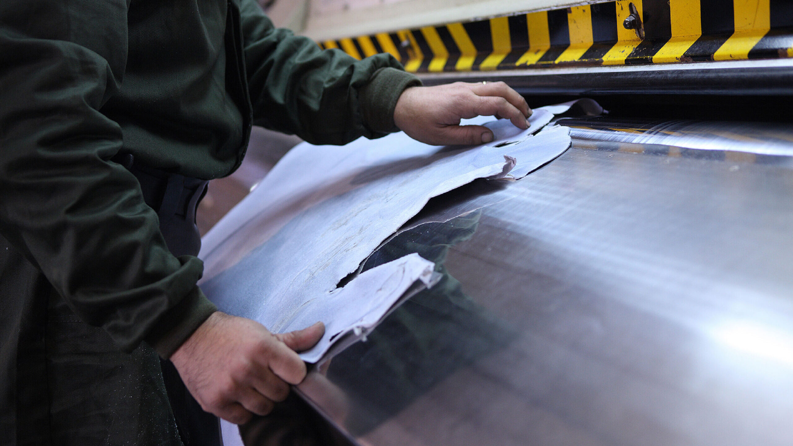 Pressatura: la pressatura strizza la pelle in modo da togliere l’acqua contenuta nella sezione della pelle e prepararla alla selezione.