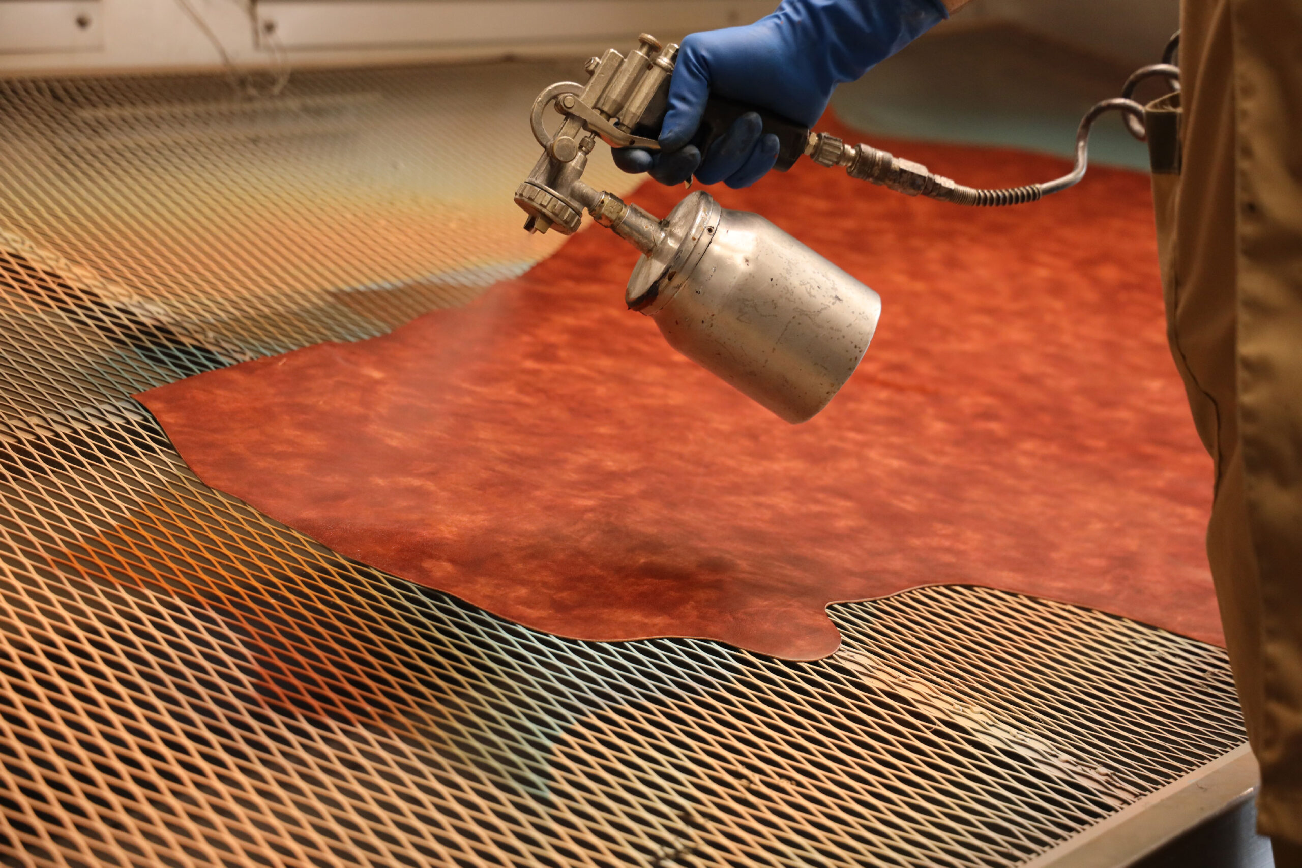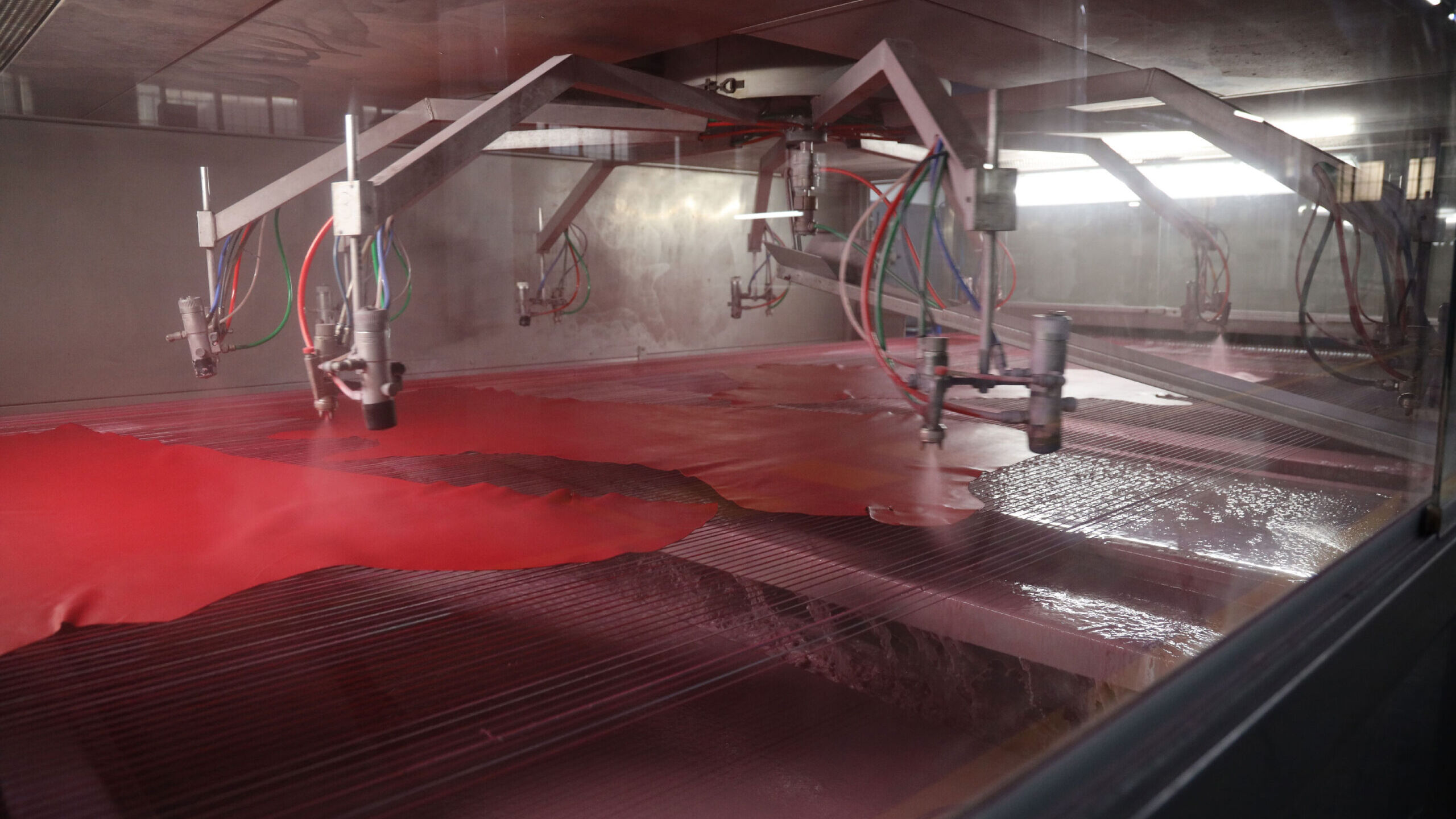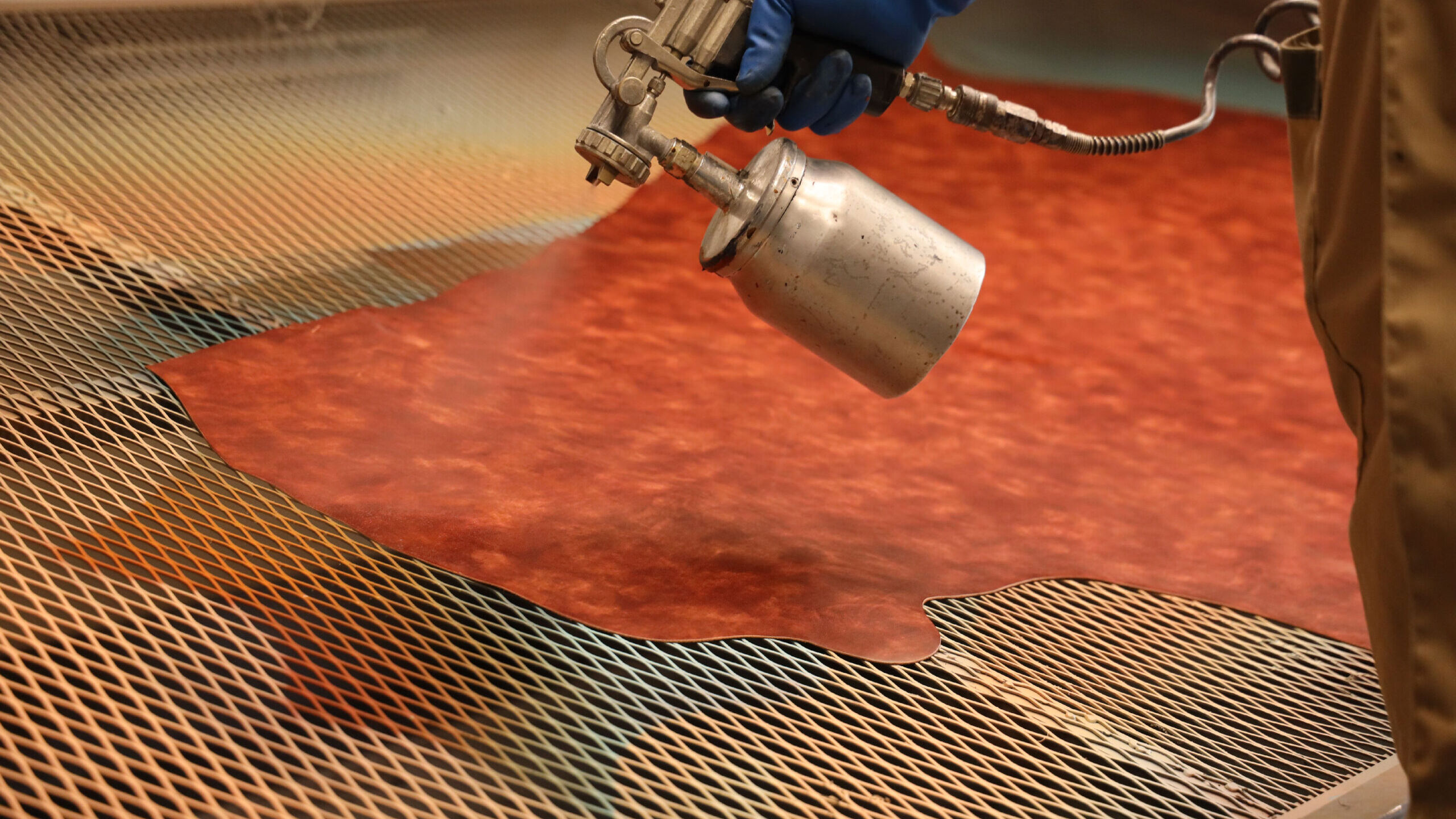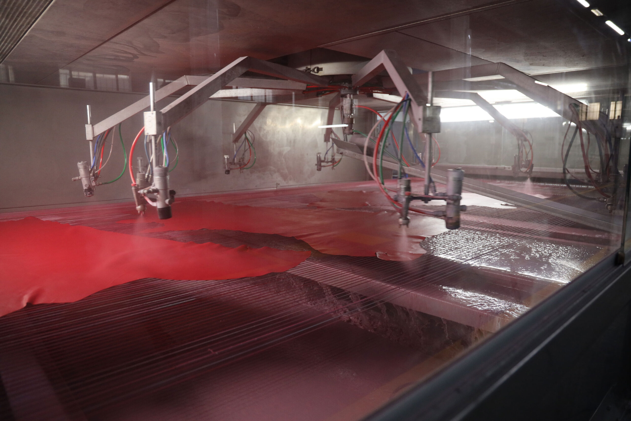 Tamponatura e spruzzatura: La rifinizione comprende vari passaggi a un macchinario (Spruzzo) dotato di pistole che spruzzano prodotti chimici liquidi sulla pelle.